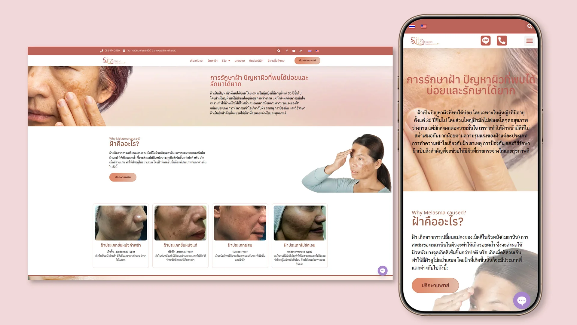 ออกแบบ UI/UX ของเว็บไซต์ โดยเริ่มจากการทำ Prompt Engineering เพื่อสร้างภาพนางแบบด้วย AI ให้ได้มู้ดแอนด์โทนที่ตรงตาม Corporate Identity (CI) ของคลินิก ควบคู่ไปกับการทำ Content Strategy ในการย่อยข้อมูลทางการแพทย์และวิธีการรักษาฝ้าที่ซับซ้อน ให้กลายเป็นเนื้อหาที่อ่านง่าย