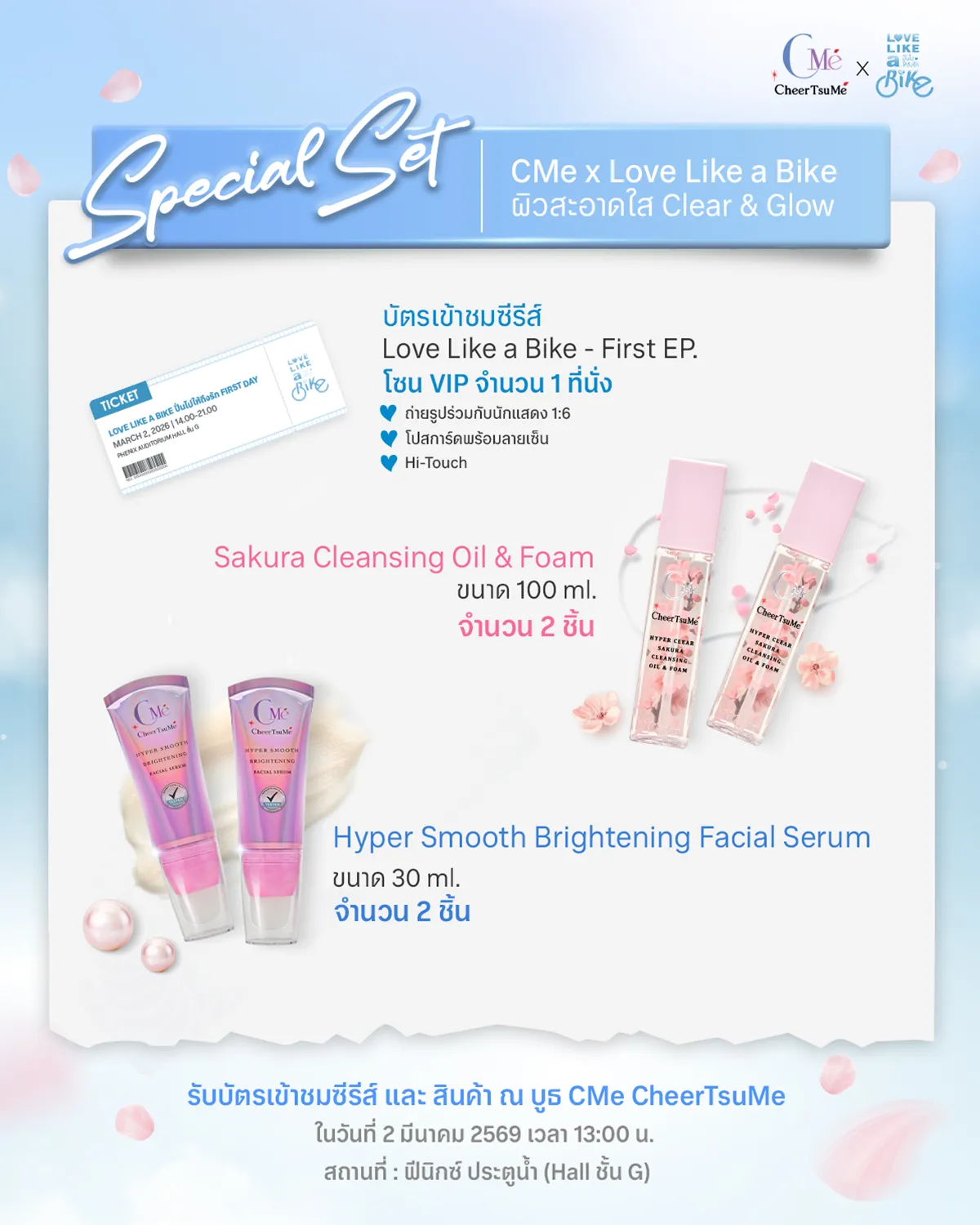 โปรเจกต์ออกแบบแบนเนอร์โซเชียลมีเดียเพื่อโปรโมทกิจกรรมสุดพิเศษ (Collaboration Event) ระหว่างแบรนด์สกินแคร์ CMe CheerTsume ซึ่งเป็นลูกค้าประจำของเรา และซีรีส์ดัง Love Like a Bike จากช่อง 3 เป้าหมายหลักของงานนี้คือการดึงดูดความสนใจจากกลุ่มแฟนคลับและลูกค้าของแบรนด์ โดยต้องสื่อสารแคมเปญให้ทรงพลังและรักษาภาพลักษณ์ที่โดดเด่นของทั้งสองฝ่ายเอาไว้อย่างลงตัว